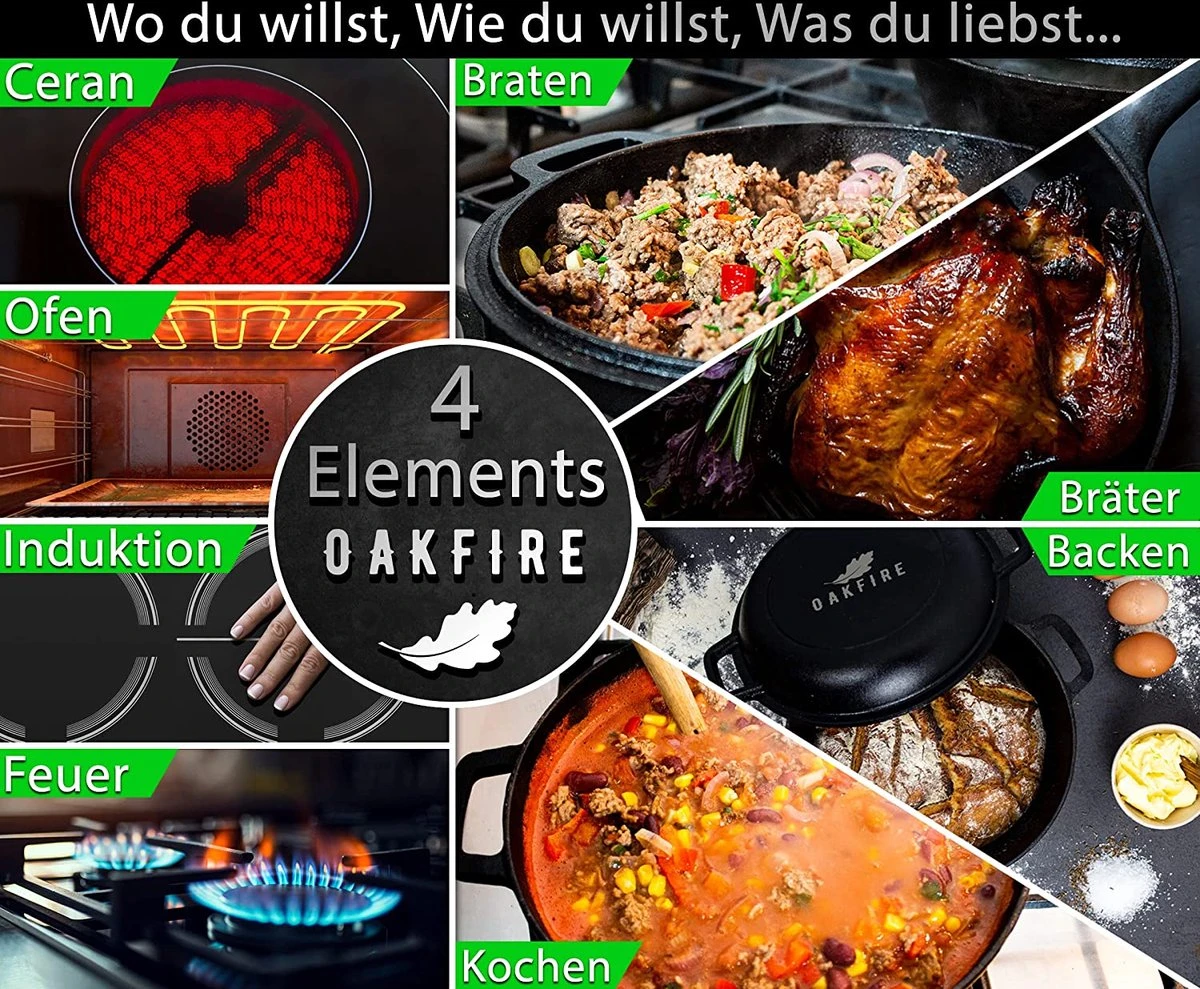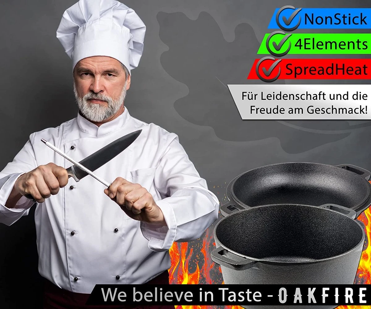 Polyvalent : Nous adorons cuisiner. La passion de la première coupe au dernier goût et la première bouchée et bien sûr l’arrière-goût. Faites l’expérience de la cuisine comme jamais auparavant avec les poêles en fonte Oakfire 2 en 1 –